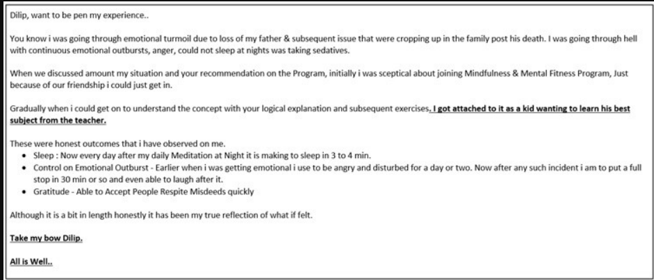 - Sleep: As mentioned earlier, the participant had trouble sleeping even for a few hours at a stretch, even with the help of sedatives. He was going to sleep at odd hours of 3-4 am! Post the program, and after adopting the exercises and techniques he learned, he is now able to calm down and go to sleep within a few minutes. This has a positive trickle-down effect across the board, with a good night’s sleep a trigger for emotional stability throughout the day!